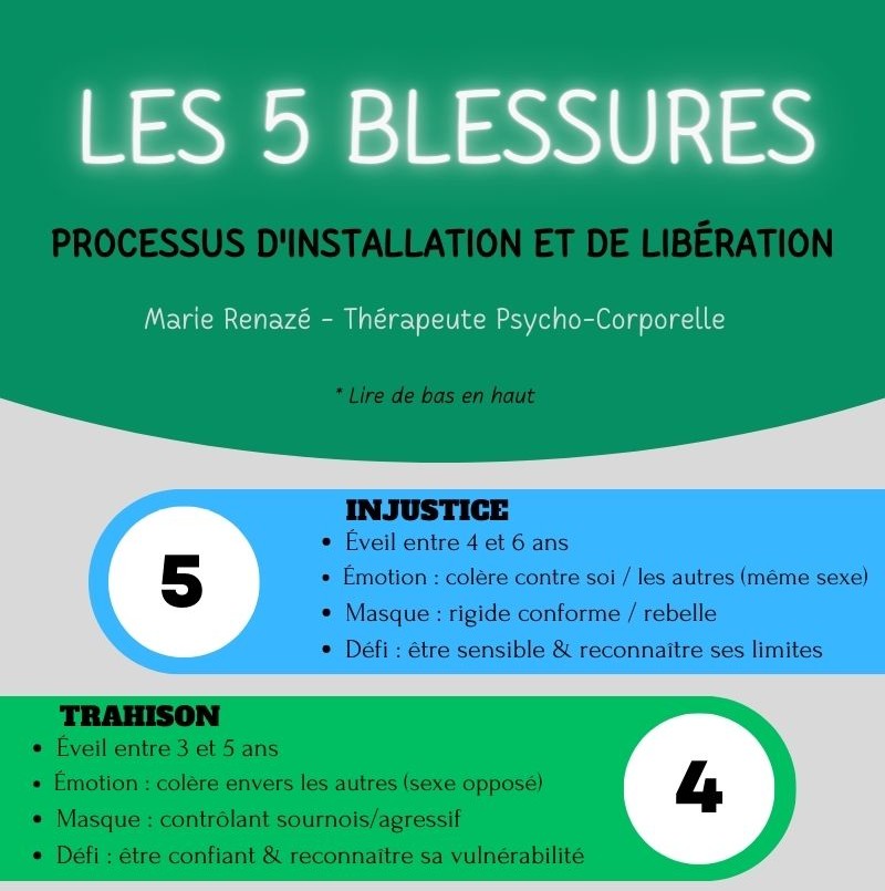 J’ai regroupé ici les éléments des blessures que j’utilise dans mes consultations ou mes stages mais je vous invite à lire les livres de Lise Bourbeau si vous souhaitez une approche plus complète.