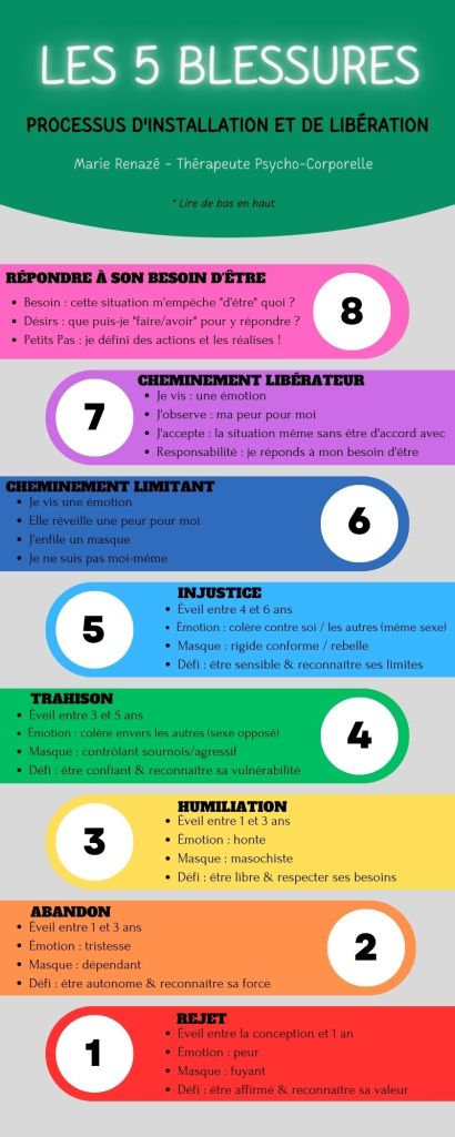 Ci-dessous le schéma des 3 articles avec les 5 blessures, les cheminements répétitif, libérateur et pour répondre à son besoin d’être. À lire de bas en haut.
